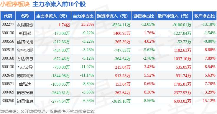 从资金流向上来看,当日小程序板块主力资金净流出3.8亿元,游资资金净流出1.13亿元,散户资金净流入4.93亿元。小程序板块个股资金流向见下表: