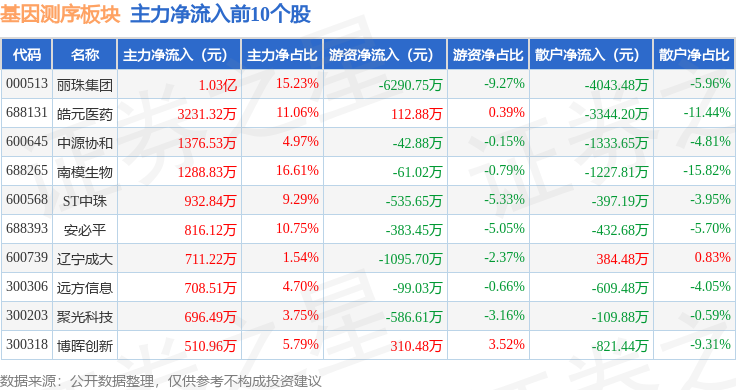 从资金流向上来看,当日基因测序板块主力资金净流出9.57亿元,游资资金净流入1.62亿元,散户资金净流入7.95亿元。基因测序板块个股资金流向见下表: