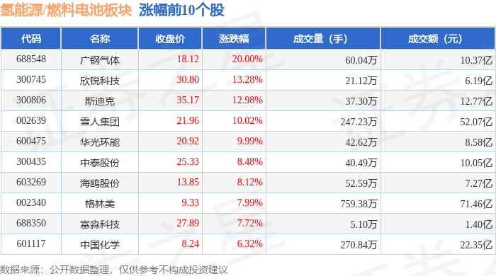 从资金流向上来看,当日氢能源/燃料电池板块主力资金净流出31.02亿元,游资资金净流出11.25亿元,散户资金净流入42.27亿元。氢能源/燃料电池板块个股资金流向见下表: