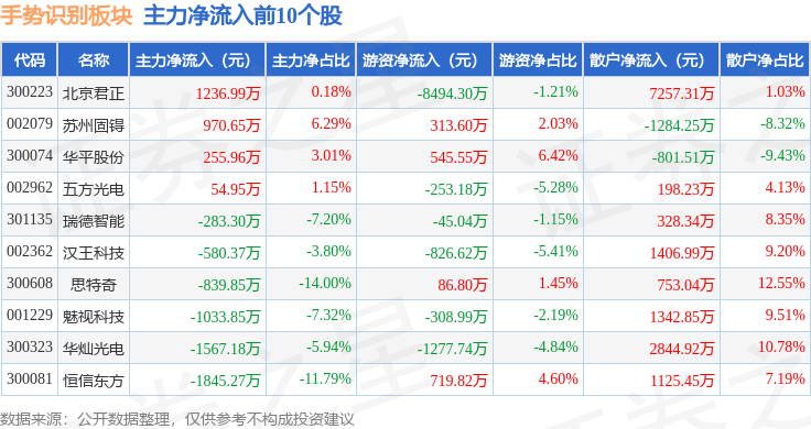 从资金流向上来看,当日手势识别板块主力资金净流出11.72亿元,游资资金净流出1.55亿元,散户资金净流入13.27亿元。手势识别板块个股资金流向见下表: