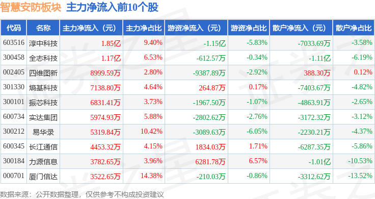 从资金流向上来看,当日智慧安防板块主力资金净流出26.13亿元,游资资金净流入7.02亿元,散户资金净流入19.11亿元。智慧安防板块个股资金流向见下表: