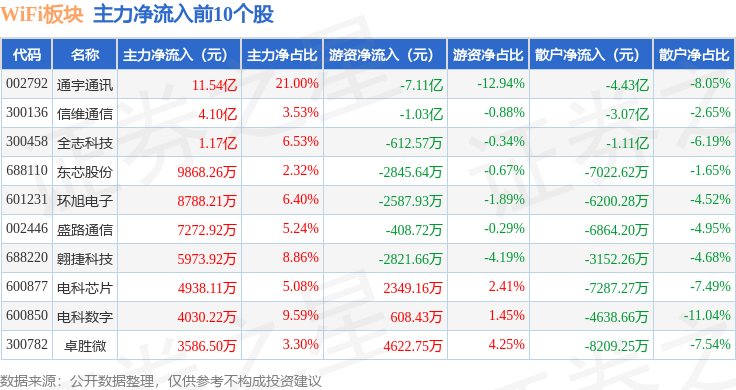 从资金流向上来看,当日WiFi板块主力资金净流入5.9亿元,游资资金净流出4.04亿元,散户资金净流出1.86亿元。WiFi板块个股资金流向见下表: