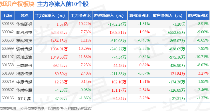 从资金流向上来看,当日知识产权板块主力资金净流出10.61亿元,游资资金净流入1.85亿元,散户资金净流入8.75亿元。知识产权板块个股资金流向见下表: