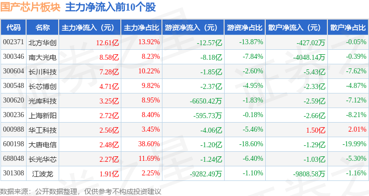 从资金流向上来看,当日国产芯片板块主力资金净流出117.06亿元,游资资金净流入1.23亿元,散户资金净流入115.82亿元。国产芯片板块个股资金流向见下表: