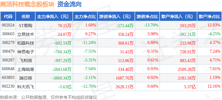 从资金流向上来看,当日商汤科技概念股板块主力资金净流出6.53亿元,游资资金净流入4949.0万元,散户资金净流入6.04亿元。商汤科技概念股板块个股资金流向见下表: