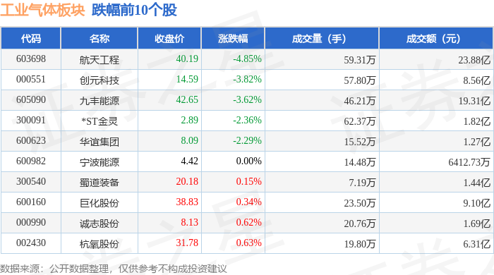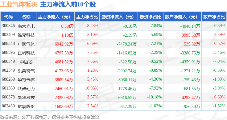 从资金流向上来看,当日工业气体板块主力资金净流入6.48亿元,游资资金净流出10.79亿元,散户资金净流入4.32亿元。工业气体板块个股资金流向见下表: