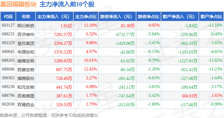 从资金流向上来看,当日基因编辑板块主力资金净流出1.18亿元,游资资金净流出1316.12万元,散户资金净流入1.31亿元。基因编辑板块个股资金流向见下表: