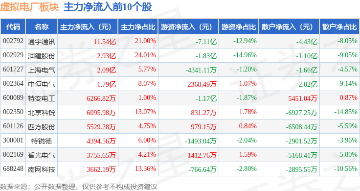 从资金流向上来看,当日虚拟电厂板块主力资金净流入15.75亿元,游资资金净流出9.64亿元,散户资金净流出6.11亿元。虚拟电厂板块个股资金流向见下表: