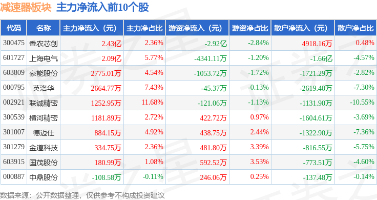 从资金流向上来看,当日减速器板块主力资金净流出9.62亿元,游资资金净流出5561.21万元,散户资金净流入10.18亿元。减速器板块个股资金流向见下表: