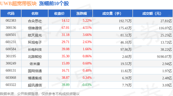 从资金流向上来看,当日UWB超宽带板块主力资金净流入1.46亿元,游资资金净流入7525.84万元,散户资金净流出2.22亿元。UWB超宽带板块个股资金流向见下表: