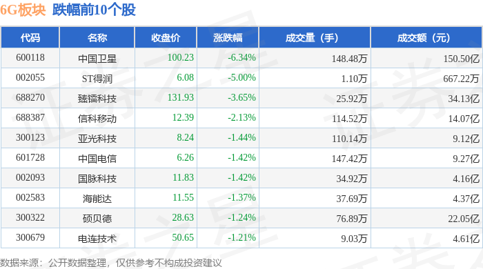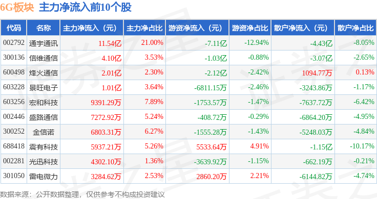 从资金流向上来看,当日6G板块主力资金净流出40.28亿元,游资资金净流入5.06亿元,散户资金净流入35.22亿元。6G板块个股资金流向见下表: