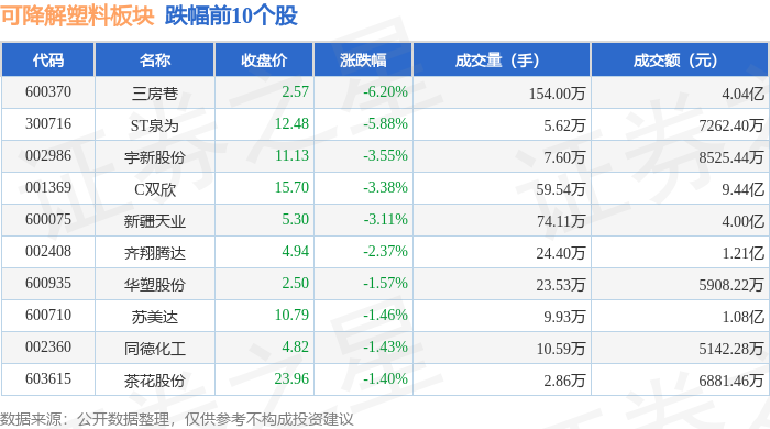 证券之星消息,1月7日可降解塑料板块较上一交易日下跌0.07%,三房巷领跌。当日上证指数报收于4085.77,上涨0.05%。深证成指报收于14030.56,上涨0.06%。可降解塑料板块个股涨跌见下表: