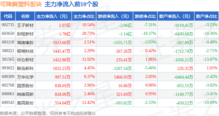 从资金流向上来看,当日可降解塑料板块主力资金净流出5.88亿元,游资资金净流出7369.85万元,散户资金净流入6.61亿元。可降解塑料板块个股资金流向见下表: