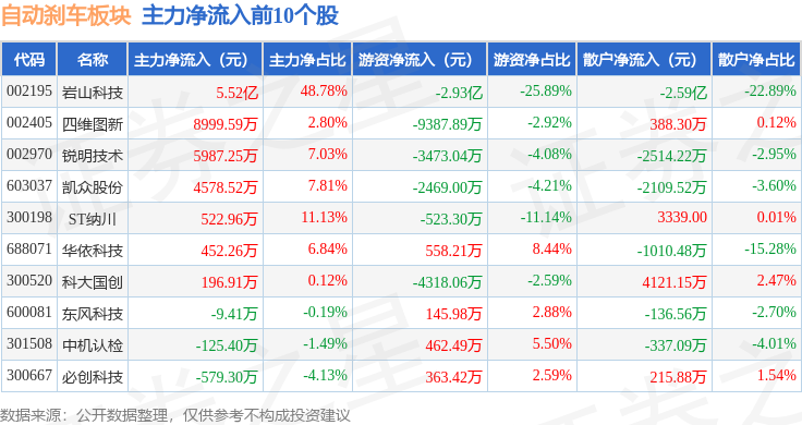 从资金流向上来看,当日自动刹车板块主力资金净流出5.63亿元,游资资金净流出3.93亿元,散户资金净流入9.56亿元。自动刹车板块个股资金流向见下表: