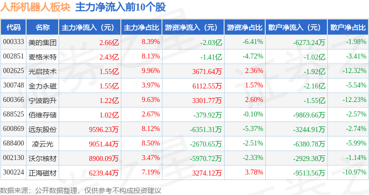从资金流向上来看,当日人形机器人板块主力资金净流出128.06亿元,游资资金净流入15.48亿元,散户资金净流入112.58亿元。人形机器人板块个股资金流向见下表: