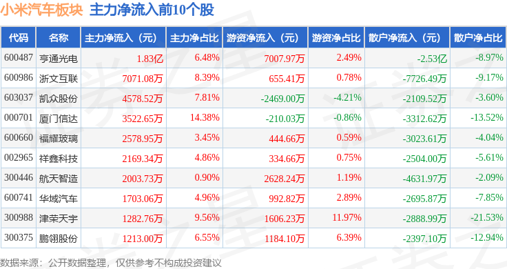 从资金流向上来看,当日小米汽车板块主力资金净流出27.85亿元,游资资金净流入3.24亿元,散户资金净流入24.62亿元。小米汽车板块个股资金流向见下表: