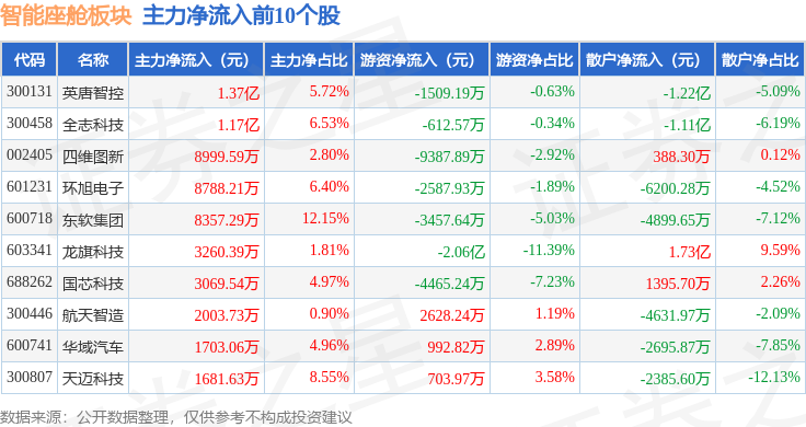 从资金流向上来看,当日智能座舱板块主力资金净流出37.15亿元,游资资金净流入1.63亿元,散户资金净流入35.52亿元。智能座舱板块个股资金流向见下表: