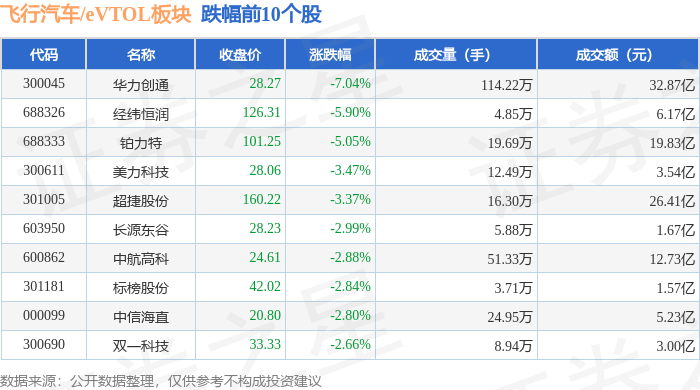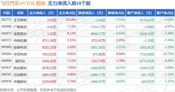 从资金流向上来看,当日飞行汽车/eVTOL板块主力资金净流出37.66亿元,游资资金净流入1969.17万元,散户资金净流入37.46亿元。飞行汽车/eVTOL板块个股资金流向见下表: