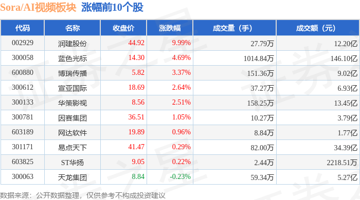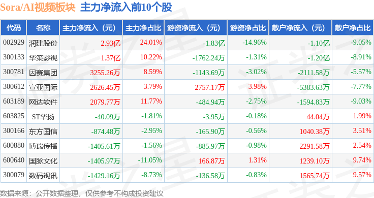 从资金流向上来看,当日Sora/AI视频板块主力资金净流出14.23亿元,游资资金净流入6012.99万元,散户资金净流入13.62亿元。Sora/AI视频板块个股资金流向见下表: