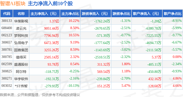 从资金流向上来看,当日智谱AI板块主力资金净流出16.65亿元,游资资金净流入3.7亿元,散户资金净流入12.94亿元。智谱AI板块个股资金流向见下表: