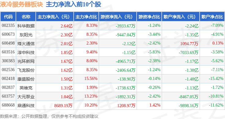 从资金流向上来看,当日液冷服务器板块主力资金净流出38.6亿元,游资资金净流入2.81亿元,散户资金净流入35.79亿元。液冷服务器板块个股资金流向见下表:
