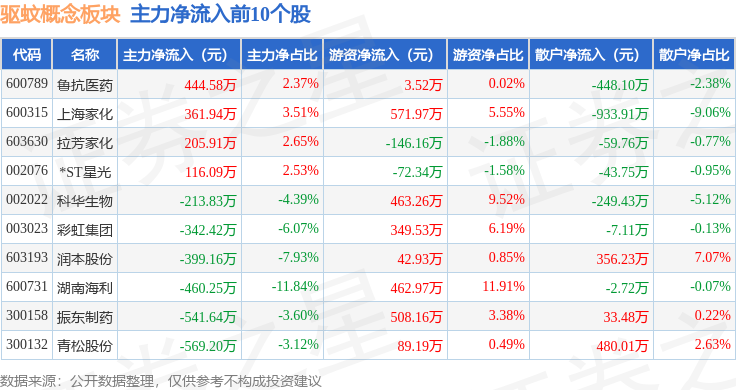 从资金流向上来看,当日驱蚊概念板块主力资金净流出2.29亿元,游资资金净流入6869.65万元,散户资金净流入1.61亿元。驱蚊概念板块个股资金流向见下表: