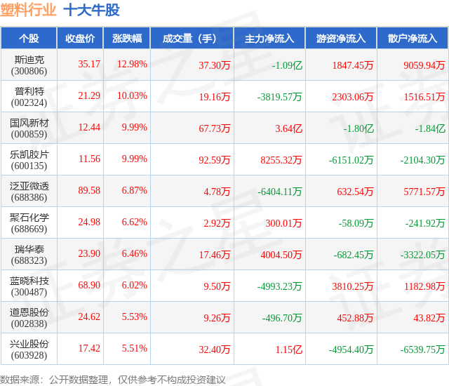 个股表现方面,塑料行业当日领涨股为斯迪克(300806),该股当日报收35.17,上涨12.98%,成交量37.3万,主力资金净流出1.09亿元。普利特(002324)以上涨10.03%紧随其后,该股当日成交量19.16万,主力资金净流出3819.57万元。除此之外,国风新材(000859)、乐凯胶片(600135)、泛亚微透(688386)均进入当日牛股之列。具体个股列表见下表: