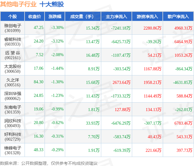 个股表现方面,其他电子行业当日领跌股为雅创电子(301099),该股当日报收47.25,下跌3.3%,成交量15.34万,主力资金净流出7241.18万元。睿能科技(603933)以下跌3.12%紧随其后,该股当日成交量13.47万,主力资金净流出6425.73万元。除此之外,远 望 谷(002161)、太龙股份(300650)、久之洋(300516)均进入当日熊股之列。具体个股列表见下表: