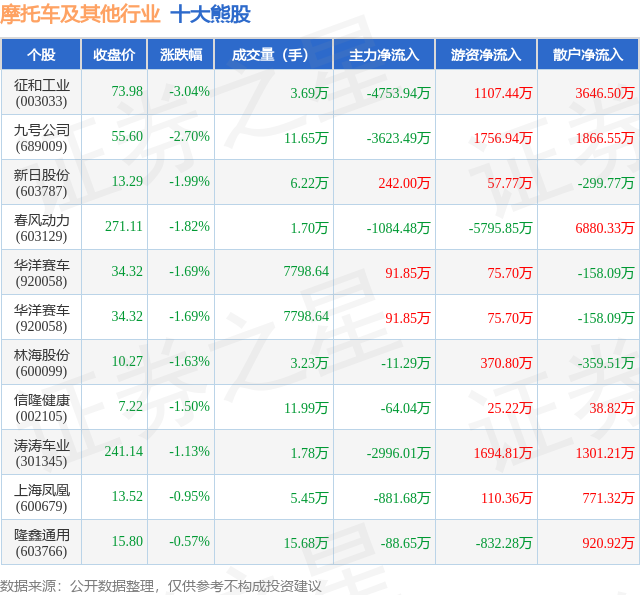 个股表现方面,摩托车及其他行业当日领跌股为征和工业(003033),该股当日报收73.98,下跌3.04%,成交量3.69万,主力资金净流出4753.94万元。九号公司(689009)以下跌2.7%紧随其后,该股当日成交量11.65万,主力资金净流出3623.49万元。除此之外,新日股份(603787)、春风动力(603129)、华洋赛车(920058)均进入当日熊股之列。具体个股列表见下表: