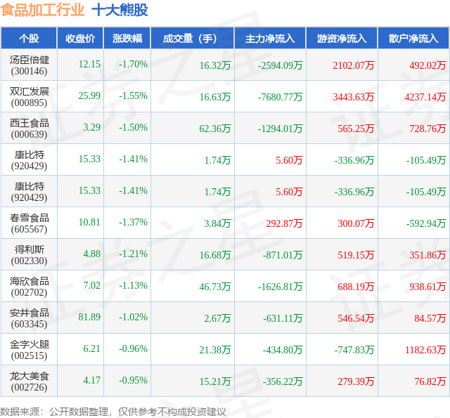 个股表现方面,食品加工行业当日领跌股为汤臣倍健(300146),该股当日报收12.15,下跌1.7%,成交量16.32万,主力资金净流出2594.09万元。双汇发展(000895)以下跌1.55%紧随其后,该股当日成交量16.63万,主力资金净流出7680.77万元。除此之外,西王食品(000639)、康比特(920429)、康比特(920429)均进入当日熊股之列。具体个股列表见下表: