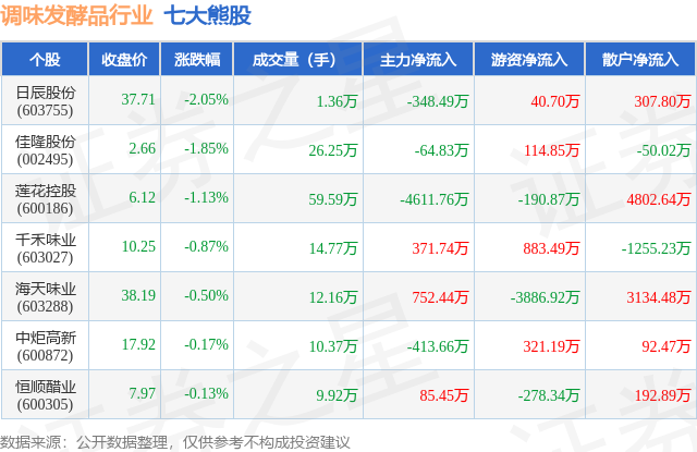 个股表现方面,调味发酵品行业当日领跌股为日辰股份(603755),该股当日报收37.71,下跌2.05%,成交量1.36万,主力资金净流出348.49万元。佳隆股份(002495)以下跌1.85%紧随其后,该股当日成交量26.25万,主力资金净流出64.83万元。除此之外,莲花控股(600186)、千禾味业(603027)、海天味业(603288)均进入当日熊股之列。具体个股列表见下表: