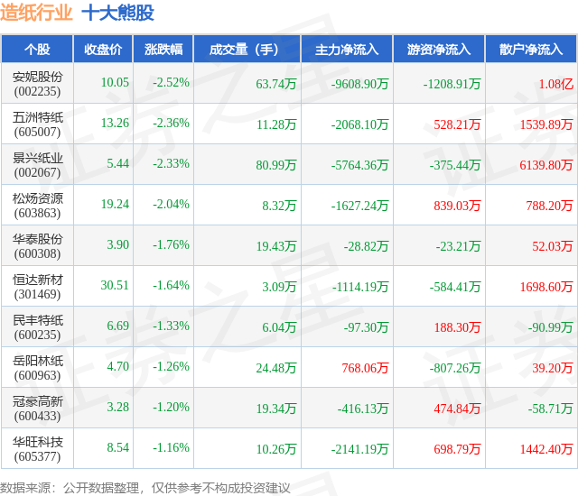 个股表现方面,造纸行业当日领跌股为安妮股份(002235),该股当日报收10.05,下跌2.52%,成交量63.74万,主力资金净流出9608.9万元。五洲特纸(605007)以下跌2.36%紧随其后,该股当日成交量11.28万,主力资金净流出2068.1万元。除此之外,景兴纸业(002067)、松炀资源(603863)、华泰股份(600308)均进入当日熊股之列。具体个股列表见下表: