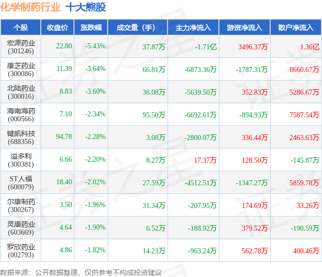 个股表现方面,化学制药行业当日领跌股为宏源药业(301246),该股当日报收22.8,下跌5.43%,成交量37.87万,主力资金净流出1.71亿元。康芝药业(300086)以下跌3.64%紧随其后,该股当日成交量66.81万,主力资金净流出6873.36万元。除此之外,北陆药业(300016)、海南海药(000566)、键凯科技(688356)均进入当日熊股之列。具体个股列表见下表: