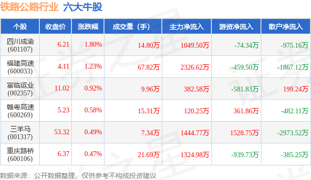 个股表现方面,铁路公路行业当日领涨股为四川成渝(601107),该股当日报收6.21,上涨1.8%,成交量14.8万,主力资金净流入1049.5万元。福建高速(600033)以上涨1.23%紧随其后,该股当日成交量67.82万,主力资金净流入2326.62万元。除此之外,富临运业(002357)、赣粤高速(600269)、三羊马(001317)均进入当日牛股之列。具体个股列表见下表: