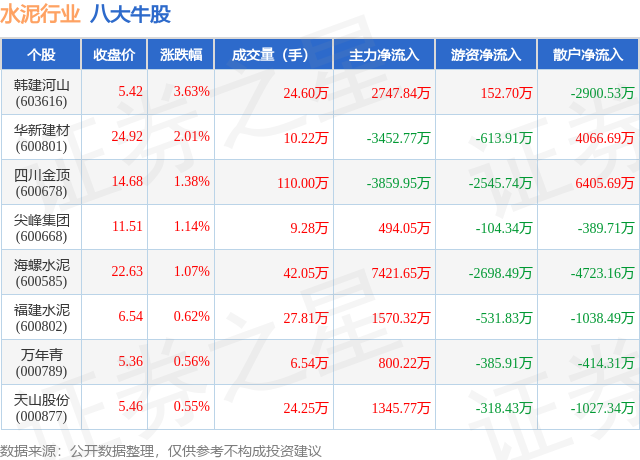 个股表现方面,水泥行业当日领涨股为韩建河山(603616),该股当日报收5.42,上涨3.63%,成交量24.6万,主力资金净流入2747.84万元。华新建材(600801)以上涨2.01%紧随其后,该股当日成交量10.22万,主力资金净流出3452.77万元。除此之外,四川金顶(600678)、尖峰集团(600668)、海螺水泥(600585)均进入当日牛股之列。具体个股列表见下表: