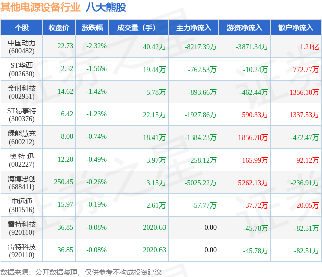 个股表现方面,其他电源设备行业当日领跌股为中国动力(600482),该股当日报收22.73,下跌2.32%,成交量40.42万,主力资金净流出8217.39万元。ST华西(002630)以下跌1.56%紧随其后,该股当日成交量19.44万,主力资金净流出762.53万元。除此之外,金时科技(002951)、ST易事特(300376)、绿能慧充(600212)均进入当日熊股之列。具体个股列表见下表: