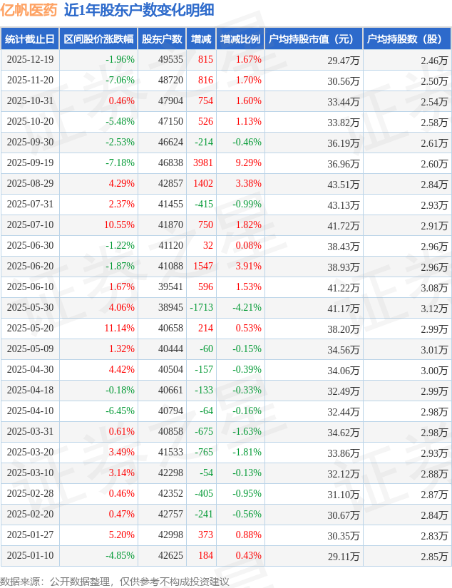 从股价来看,2025年11月20日至2025年12月19日,亿帆医药区间跌幅为1.96%,在此期间股东户数增加815.0户,增幅为1.67%。
