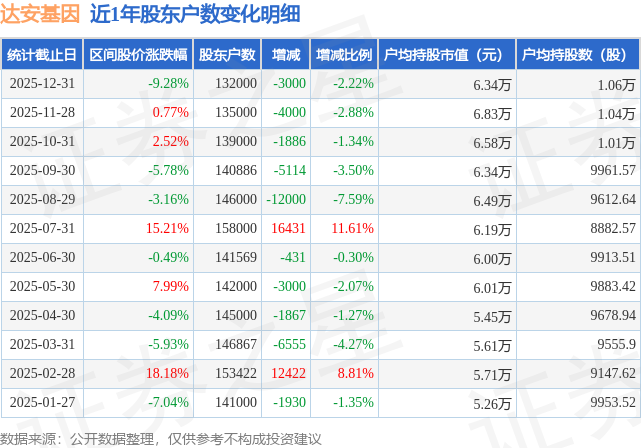 从股价来看,2025年11月28日至2025年12月31日,达安基因区间跌幅为9.28%,在此期间股东户数减少3000.0户,减幅为2.22%。