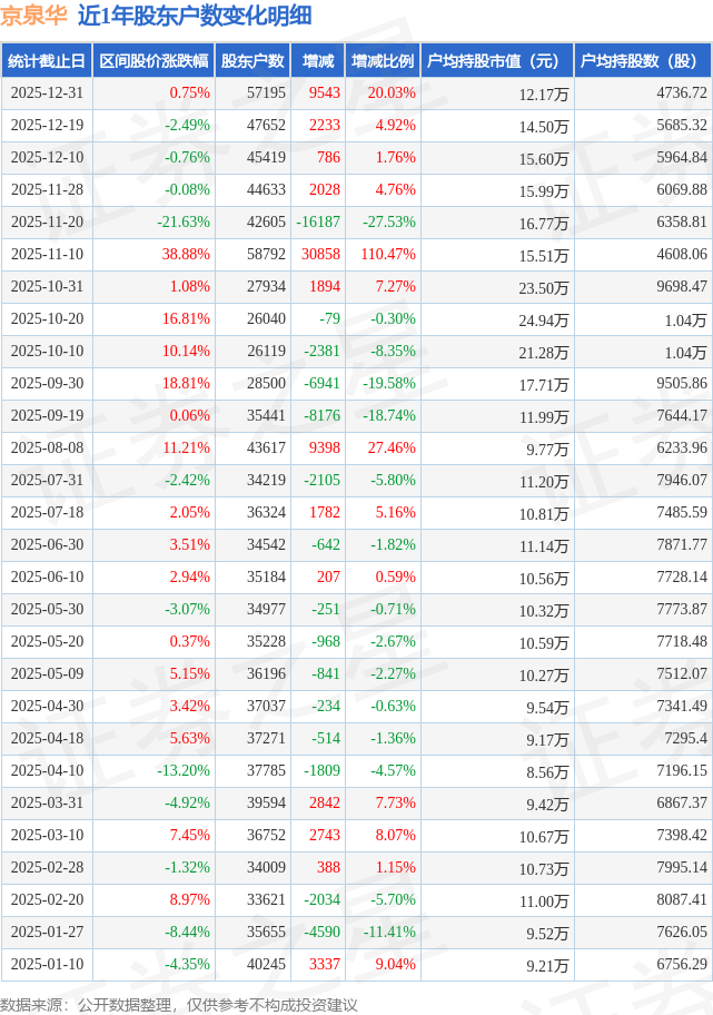 从股价来看,2025年12月19日至2025年12月31日,京泉华区间涨幅为0.75%,在此期间股东户数增加9543.0户,增幅为20.03%。