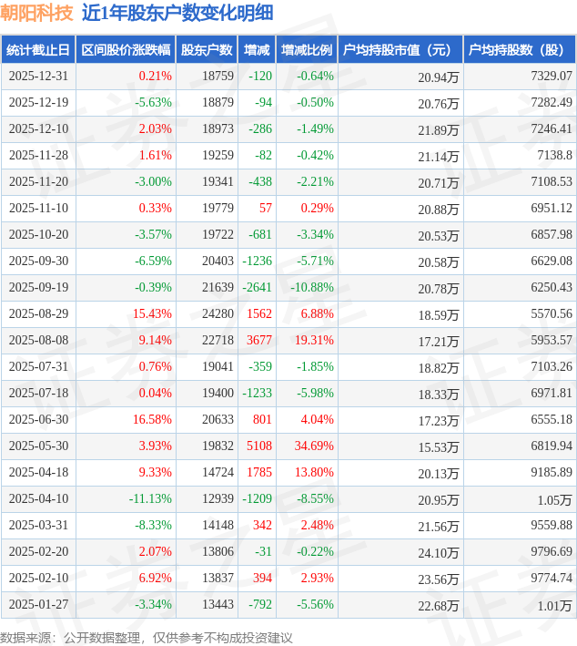 从股价来看,2025年12月19日至2025年12月31日,朝阳科技区间涨幅为0.21%,在此期间股东户数减少120.0户,减幅为0.64%。