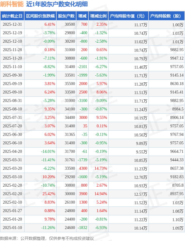 证券之星消息,近日朗科智能披露,截至2025年12月31日公司股东户数为3.05万户,较12月19日增加700.0户,增幅为2.35%。户均持股数量由上期的1.03万股减少至1.0万股,户均持股市值为11.17万元。