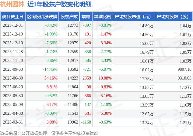 从股价来看,2025年12月19日至2025年12月31日,杭州园林区间跌幅为0.42%,在此期间股东户数减少397.0户,减幅为3.01%。