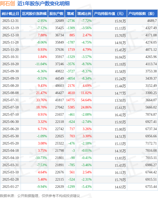 从股价来看,2025年12月19日至2025年12月31日,阿石创区间跌幅为2.95%,在此期间股东户数减少2736.0户,减幅为7.72%。