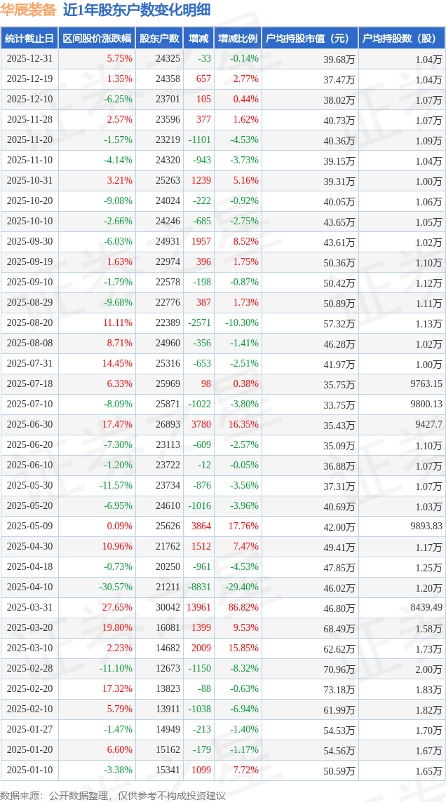 从股价来看,2025年12月19日至2025年12月31日,华辰装备区间涨幅为5.75%,在此期间股东户数减少33.0户,减幅为0.14%。