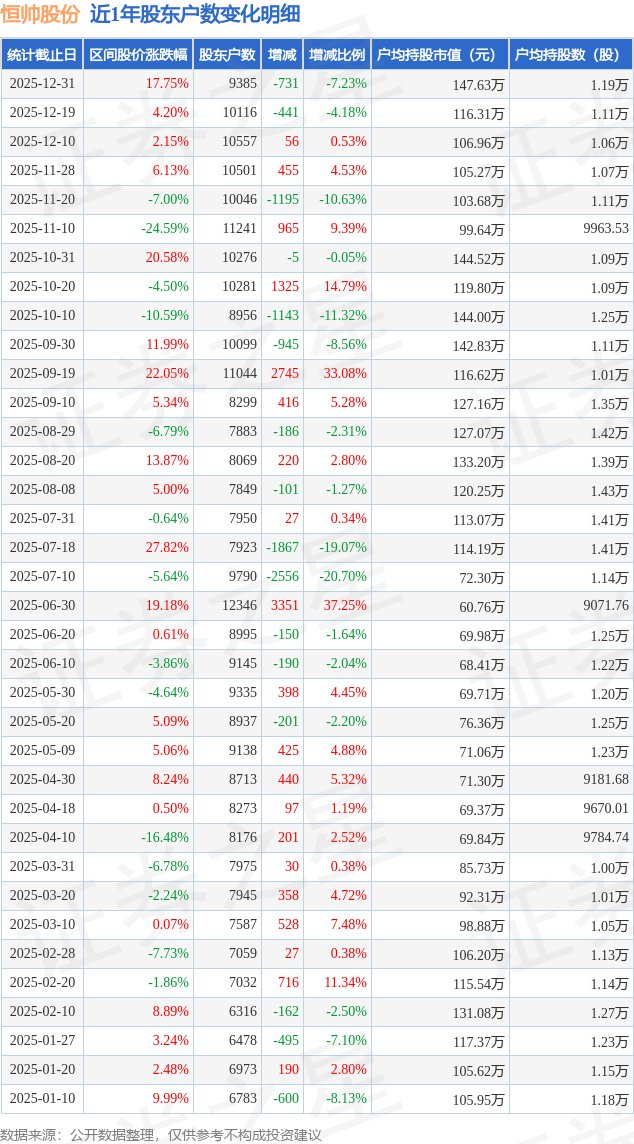 从股价来看,2025年12月19日至2025年12月31日,恒帅股份区间涨幅为17.75%,在此期间股东户数减少731.0户,减幅为7.23%。
