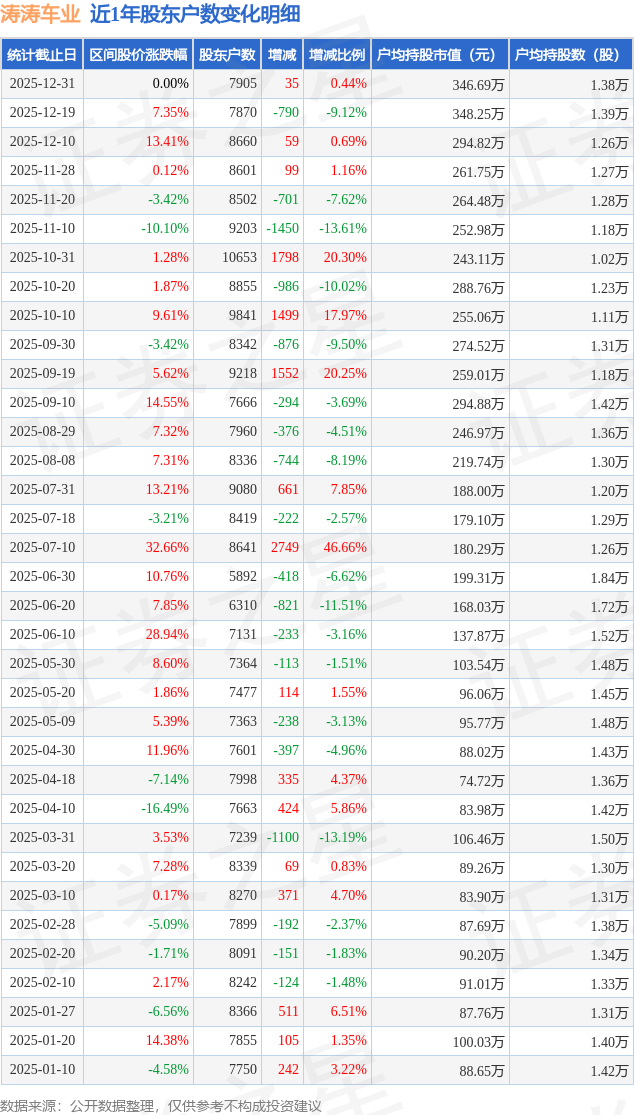 从股价来看,2025年12月19日至2025年12月31日,涛涛车业区间跌幅为0.0%,在此期间股东户数增加35.0户,增幅为0.44%。