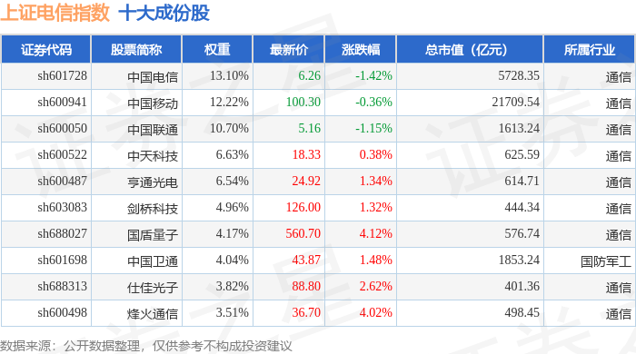 证券之星消息,1月7日,上证电信(000040)指数报收于4091.61点,涨0.54%,成交526.23亿元,换手率1.2%。当日该指数成份股中,上涨的有13家,东方明珠以9.99%的涨幅领涨,下跌的有20家,南方传媒以3.77%的跌幅领跌。