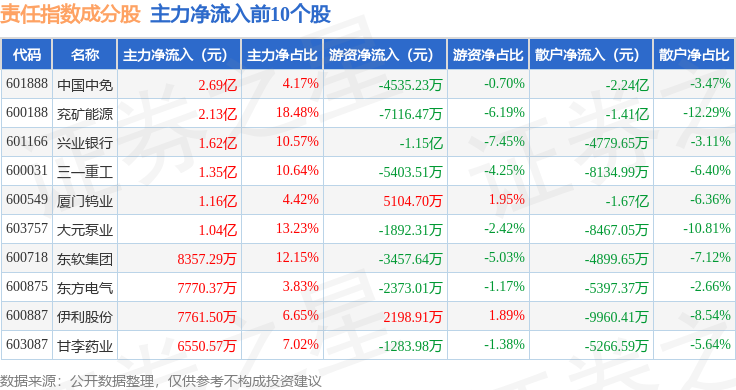 资金流向方面,责任指数(000048)成份股当日主力资金净流出合计11.59亿元,游资资金净流入合计6.45亿元,散户资金净流入合计5.15亿元。成份股资金流向详情见下表: