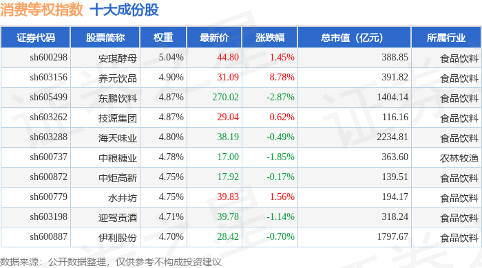 消费等权(000074)指数十大成份股详情如下: