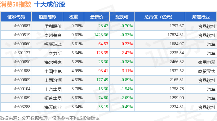 消费50(000126)指数十大成份股详情如下: